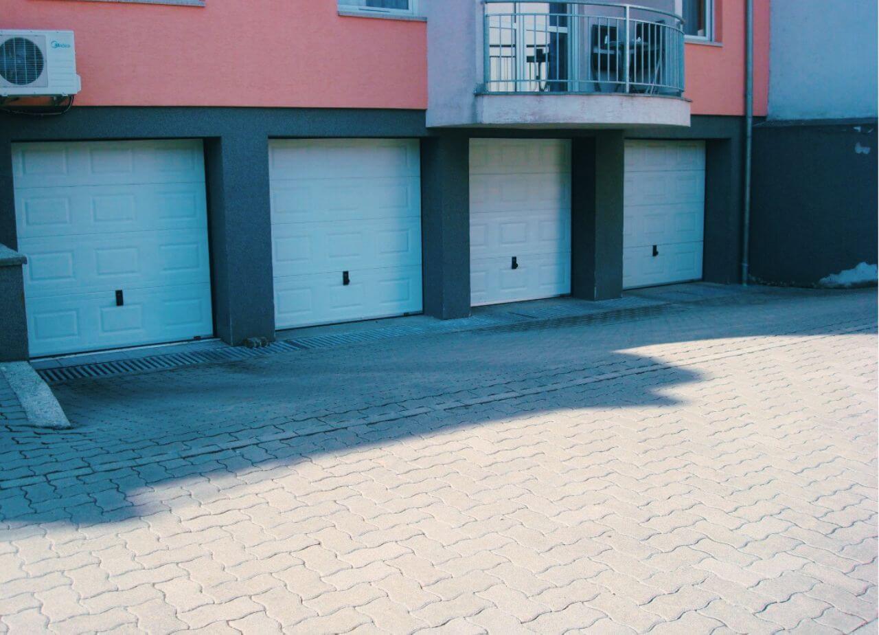 A garázsok a társasház belső udvaráról közelíthetők meg. Minden garázsnak van hátsó kijárata is, mely az alagsori folyosóra nyílik. A belső udvarra a társasház elektromos kapuján keresztül lehet behajtani. A garázsajtók egy része elektromos, másik része mechanikus nyitású. Minden garázshoz külön mérőóra tartozik.